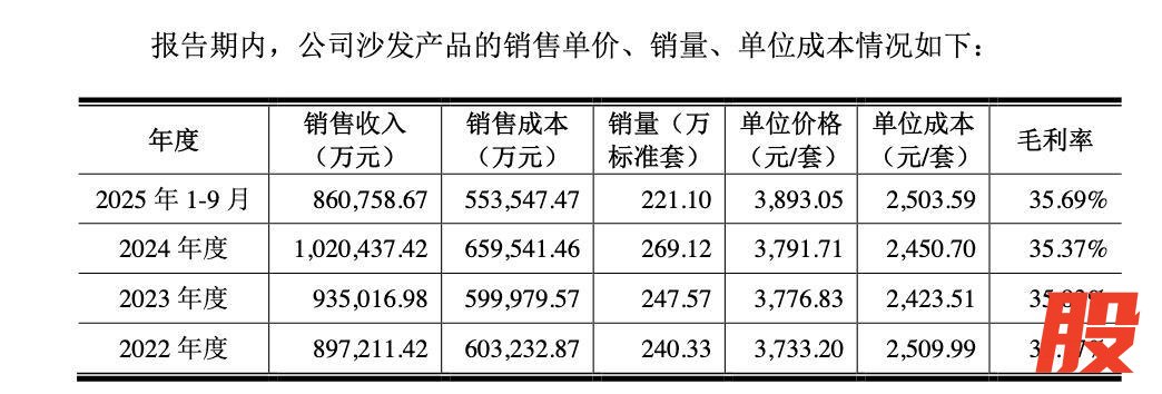 按照顾家家居沙发2503.59元/套的成本价计算,公司若按3893.05元/套的平均价格出售,毛利率在35.69%。